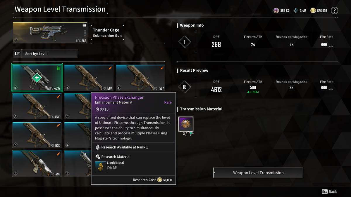You don’t specifically level up weapons in The First Descendant. Instead, you can transfer the level of a higher weapon to a lower-level weapon. This process destroys the higher-level weapon.