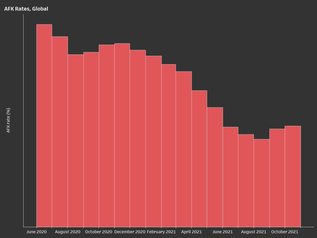 The AFK rate remained at a similar level throughout 2020. But after Riot created an improved AFK detection system and issued penalties for repeat offenders in early 2021, AFKs have taken a dive.