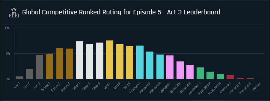 The rank tier and division players are placed in are determined by their rank rating, a performance-based rating system that goes up and down based on player performance in matches compared to the player’s expected performance. While Riot will occasionally release the ranked distribution numbers, other sites like tracker.gg provide this information year-round.