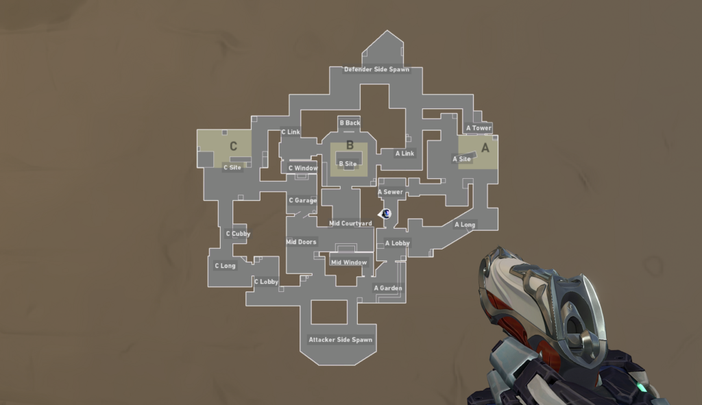 Here is the in-game map for Bind, with most of the basic callouts listed. This map doesn’t include specific callouts for the A site, B site, or C site, however.