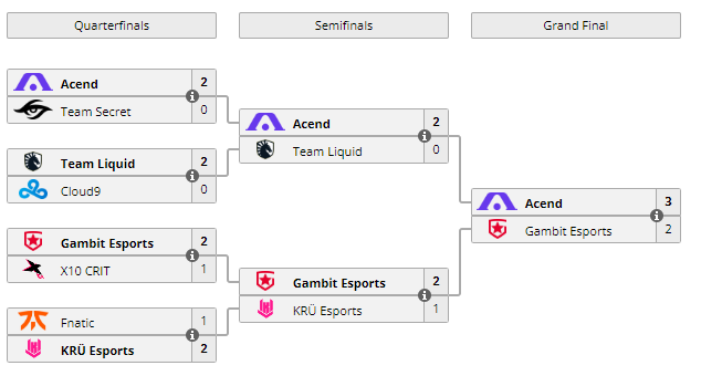 - 11am CT: Acend 2-0 Team Secret (Acend 13-8 Icebox, 13-6 Breeze) (Quarterfinals)
