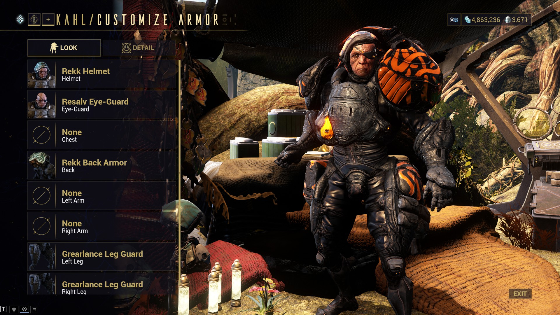 Customizing Kahl is similar to customizing a Warframe or even changing how your Operator or Drifter look. Kahl has a series of armor options, with more becoming available as you rank up with Kahl’s Garrison. You can change his helmet, eye guard, and the armor on his chest, back, shoulders, and legs. Kahl can also borrow the leg, shoulder, and chest pieces from your Warframes, adding an extra layer of customization to the game (and you can even get him to match your favorite Warframe). You can apply any owned color palette to Kahl.