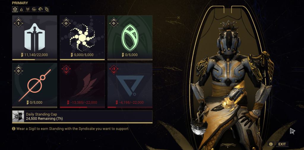 Players have a maximum amount of Standing they can earn each day (16,000 + 500 for each Mastery Rank), which resets at midnight UTC (7pm CT without accounting for timezones). All Syndicates have multiple ranks and offer better wares based on reputation, and you can check their Standing and rank at any time by heading into the Syndicates part on your Orbiter, to the left of the Navigation computer. This also allows you to travel straight to representatives and save you some time.