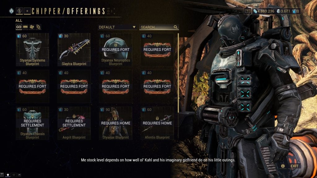 If you have the Platinum to spare, this will likely be the quickest (and most expensive) way to get your hands on some Archon mods. Chipper is located on Kahl’s Garrison, on the right side of the hut-like structure where Kahl-175 also stands.