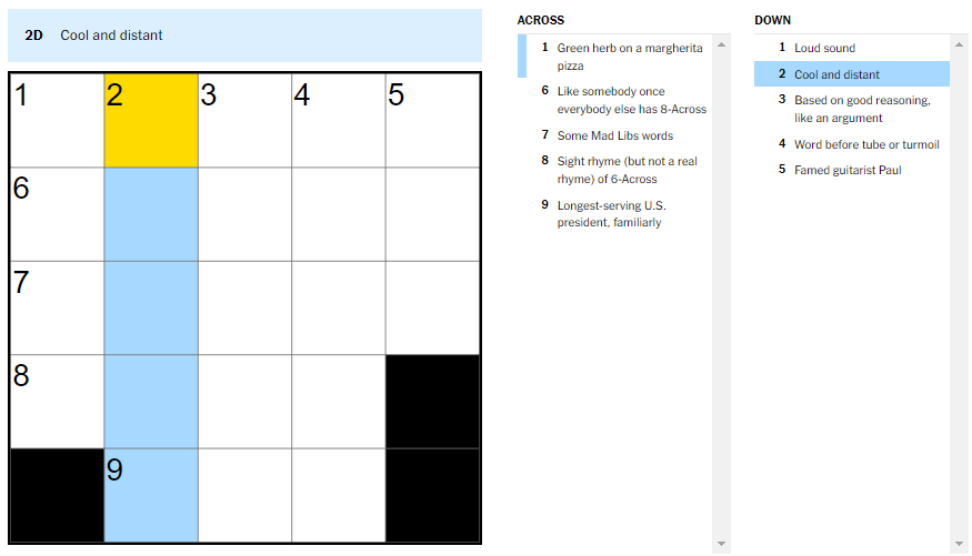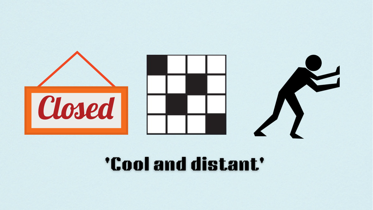 Have you ever met someone reserved who only minds their own business? I pray for these people to come and sit next to me on a long flight. Today’s NYT Mini Crossword clue, “Cool and distant,” asks you to find a word to describe these people based on their behavior.