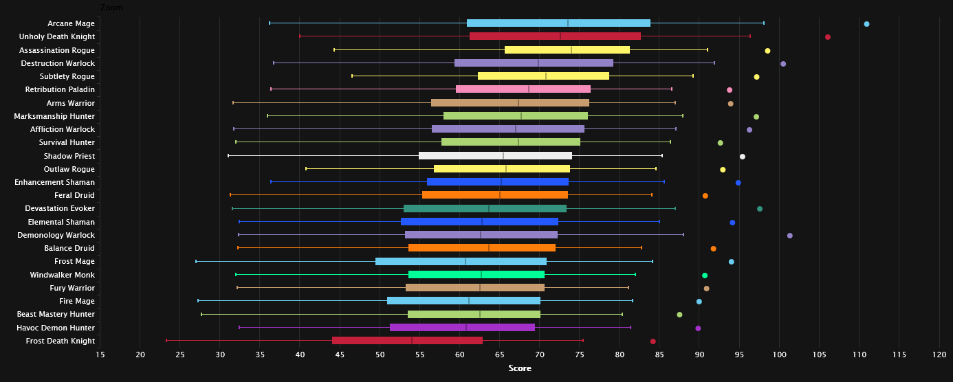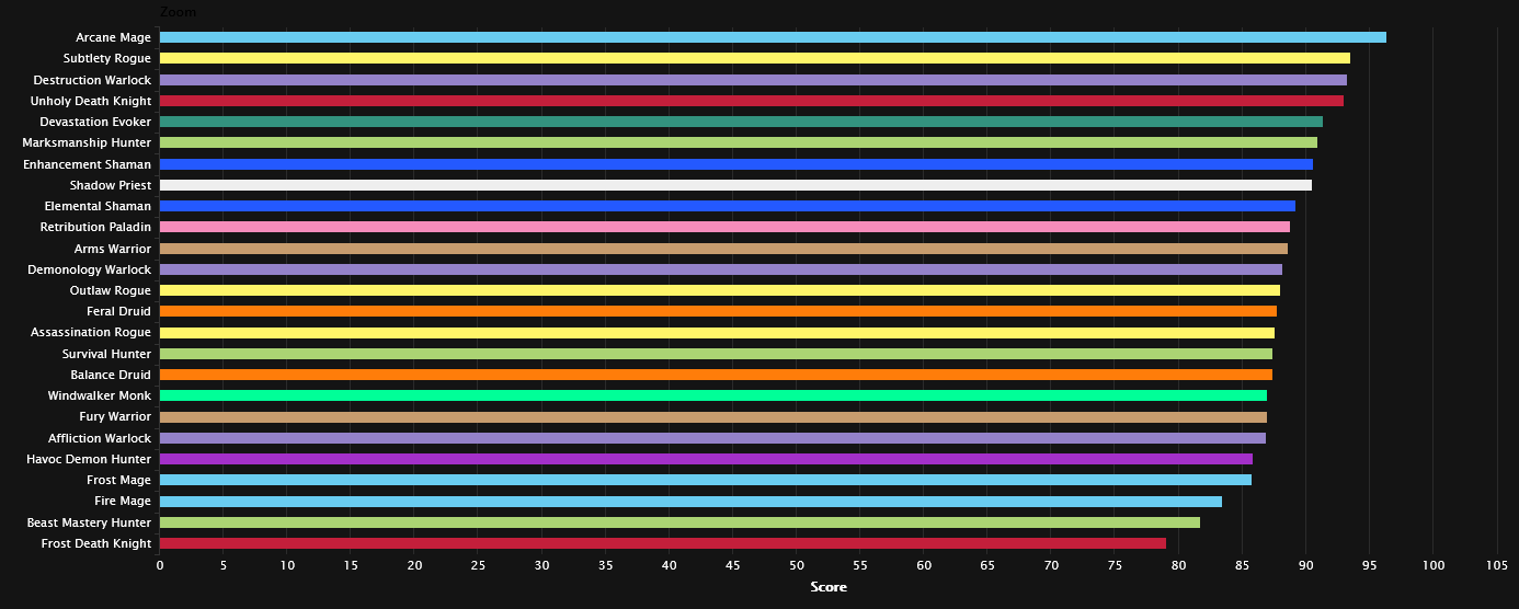 According to the first logs from Aberrus on May 17, Arcane Mages are sitting on the top DPS throne with most other DPS specs falling far behind. While Arcane Mages are effortlessly mopping the floor with Beast Mastery Hunters and Havoc Demon Hunters, Subtlety Rogues and Destruction Warlocks are doing their best to match the overall 95th Percentile Arcane Mage DPS.