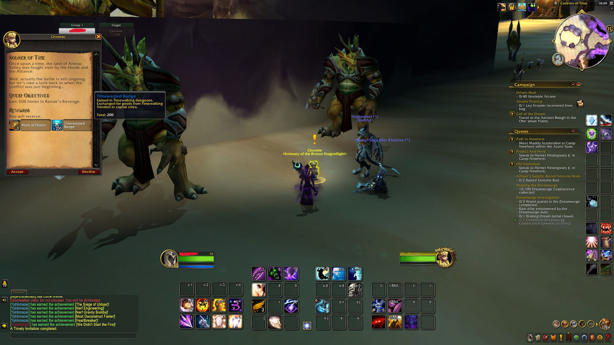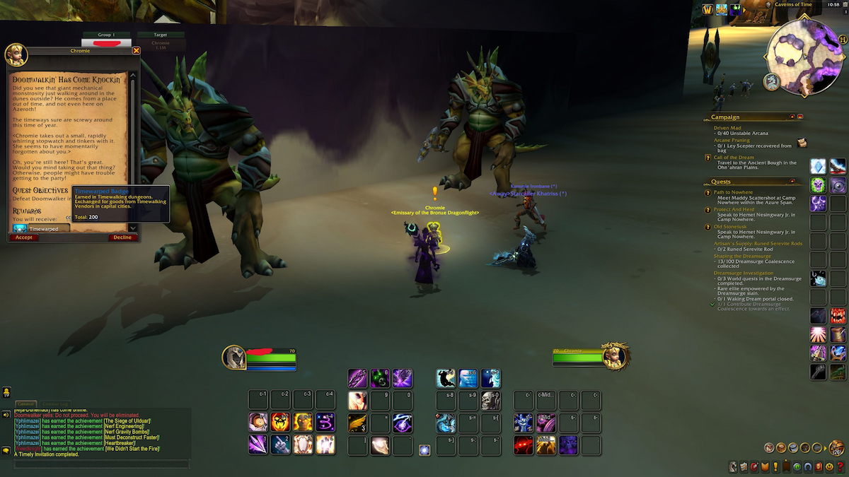 You’ll also get a quest to visit Chromie in the Caverns of Time. Go to your Capital and take a portal there (or walk there, if you want, the weather is probably lovely). You may see a giant Doomwarden in front of the entrance to the Caverns of Time and there will probably be a few players fighting him. You can join in now, but you’ll have to kill him again after accepting a quest from Chromie.