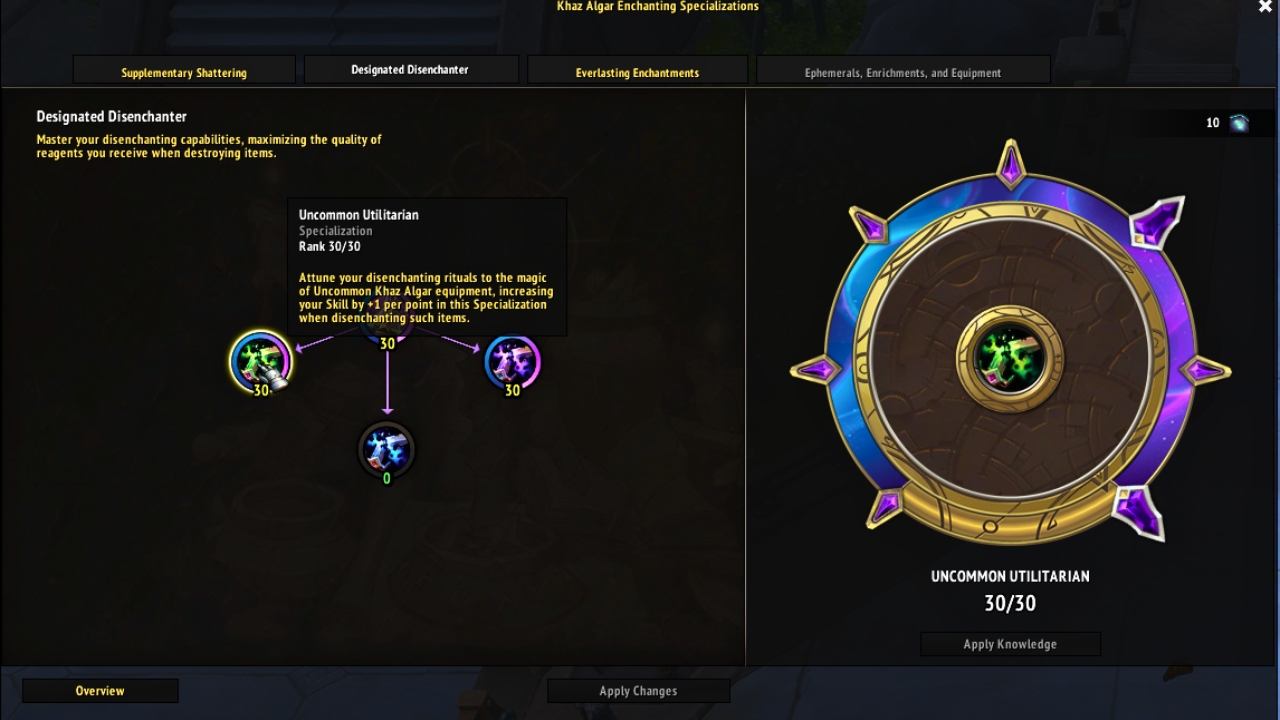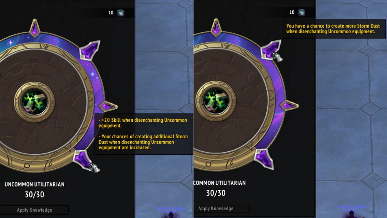 If you choose the Designated Disenchanter specialization, you have a better chance of obtaining Storm Dust; the Uncommon Utilitarian branch of this specialization buffs chances of getting higher quality reagants and bonus materials if you disenchant items at ranks 20 and 30. If you want to increase the quantity and quality chances of Storm Dust, max this specialization.