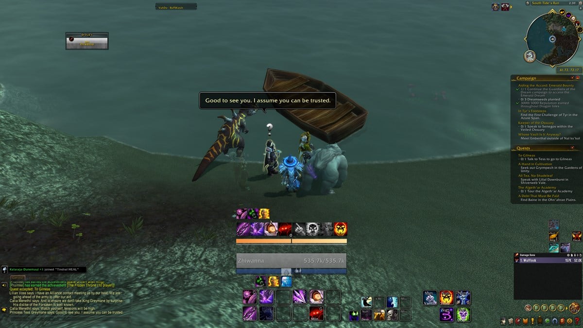 If you’re playing Alliance, getting to Gilneas is easy. In Valdrakken, find Greyguard Elite near the Stormwind Portal and accept the Summons to Lord Greymane quest. Take the portal to Stormwind and go to Stormwind Harbor (35.28). There, you’ll find Genn Greymane. Turn in the quest and accept To Gilneas. Talk to Lord Greymane again and say you’re ready. You will then automatically mount a griffin and fly towards Gilneas. Here’s what I don’t get. Why go to a ship harbor and then board a flying mount? Regardless, you’ll fly straight there.