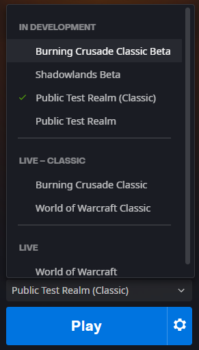 To get into the Classic PTR, all you’ll need to do is open up the Battle.net application on your computer and with the “Game Version” drop down menu, select “Public Test Realm (Classic)” under the “In Development” category.