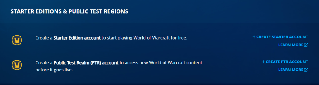 At the bottom of the next screen, you’ll see an option to create a PTR account so that you can “access new World of Warcraft content before it goes live.”