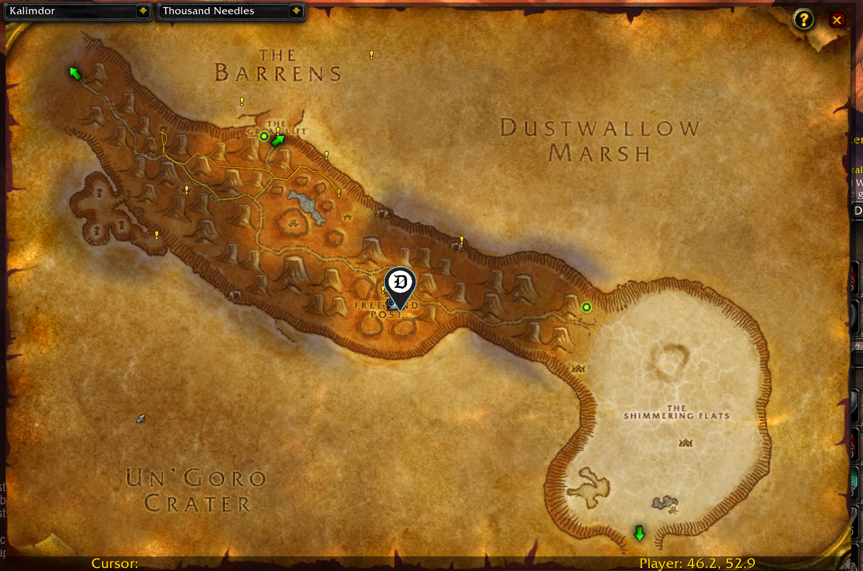First, head to Freewind Post, the Horde’s hub in Thousand Needles. When you get there, take the bridge leading to north. Follow the path until you reach the third bridge, then look down over the left side of the bridge. You will see a big stone shaped like a mushroom, and you have to jump down and land on it.