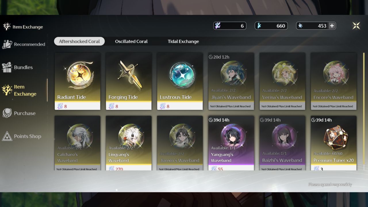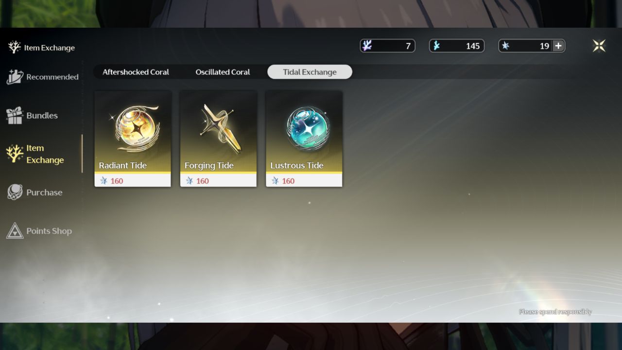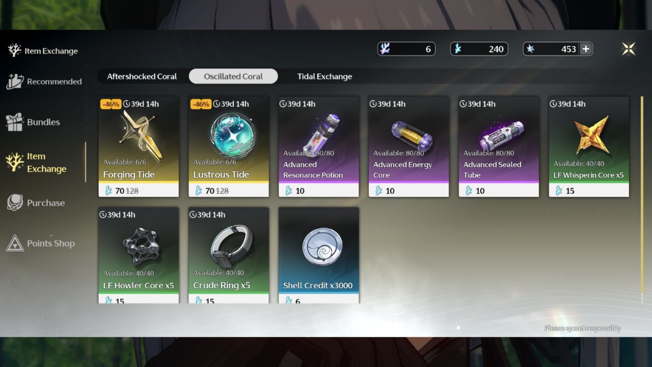 | Oscillated Coral Exchange (Item Shop) | 70 Oscillated Corals for one Radiant Tide or Lustrous Tide (First-time discount) 128 Oscillated Corals for one Radiant Tide or Lustrous Tide. | You can only get six of each Lustrous and Radiant Tides at that reduced price. Once you’ve purchased all the Lustrous or Radiant Tides using the Oscillated Corals, they’ll disappear from the Oscillated Coral exchange until it refreshes. When it does, it will likely return to its original exchange cost of 128 Oscillated Corals. |