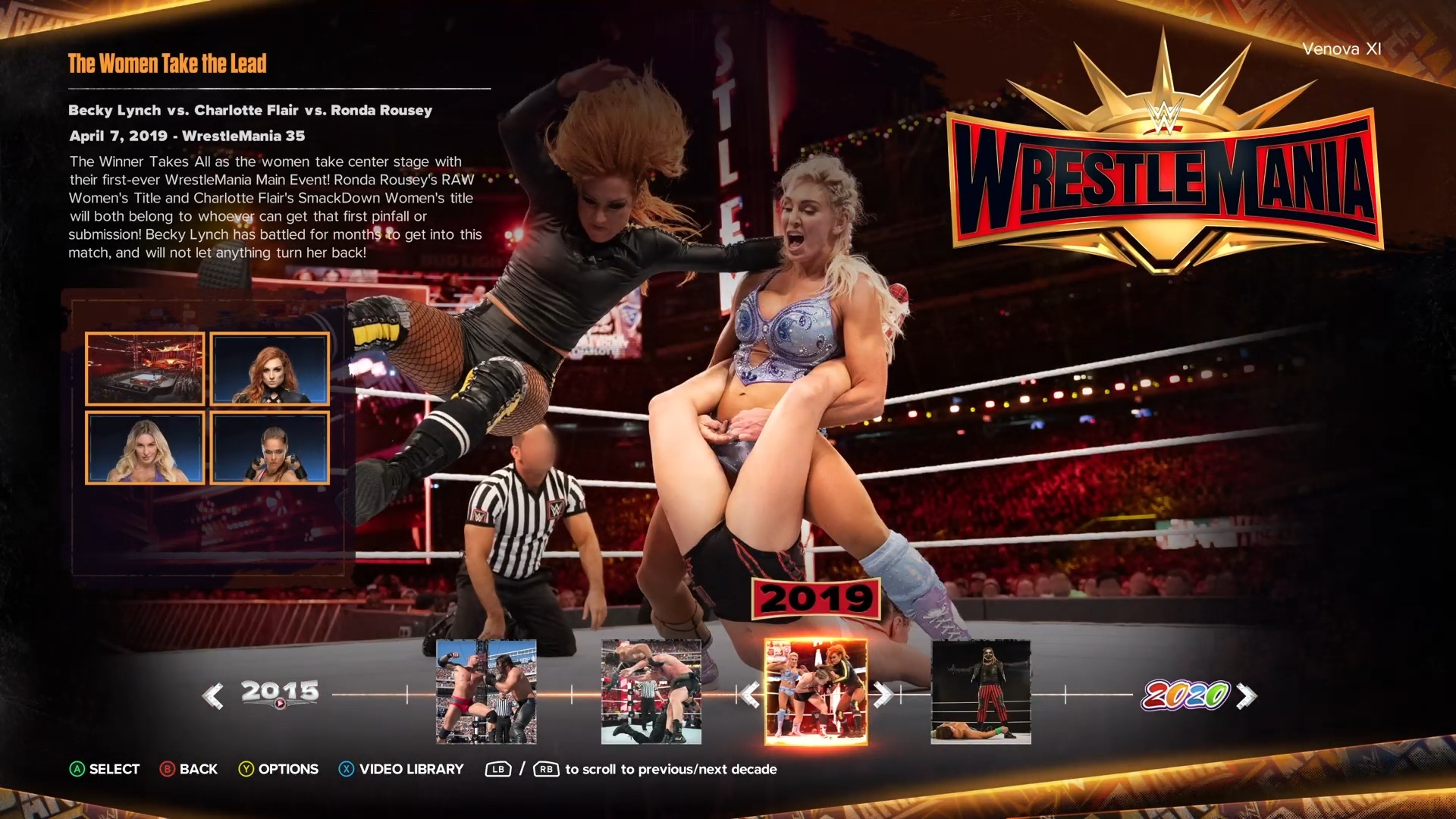 Becky Lynch vs. Charlotte Flair vs. Ronda Rousey: Triple Threat Match for WWE Raw Women’s Championship and WWE SmackDown Women’s ChampionshipWrestleMania 35– Becky Lynch ’19