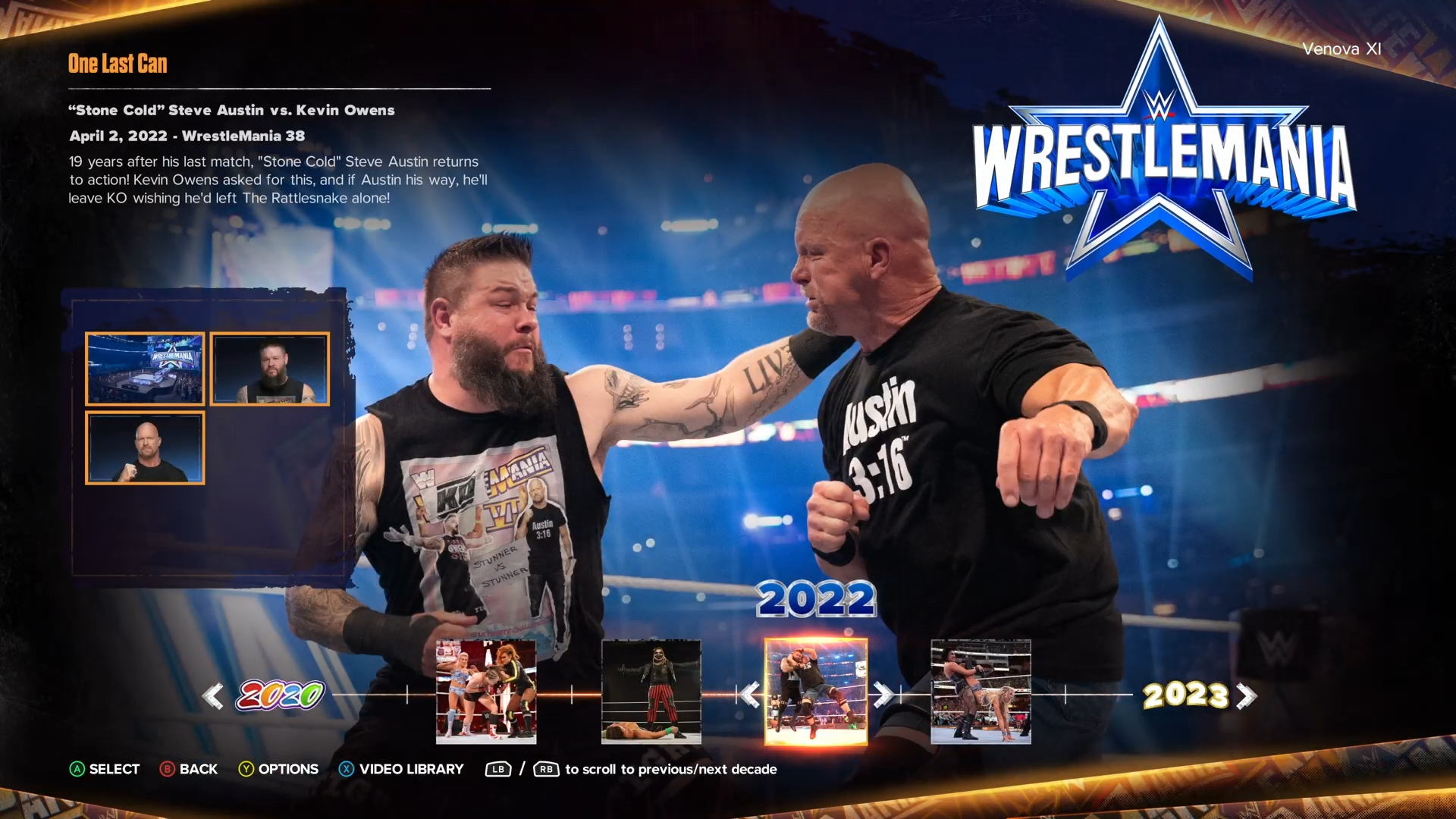 “Stone Cold” Steve Austin vs. Kevin Owens: No Holds Barred MatchWrestleMania 38– “Stone Cold” Steve Austin ’22