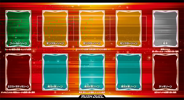 Rush Duel is treated as a new mechanic that takes a lot of what Duel Links and Speed Duels changed from the original game and adds additional rules to it. Similarities include the smaller field, which features three Monster Zones and three Spell and Trap Zones, along with the standard spots for the Main Deck, Extra Deck, Field Spell Zone, and Graveyard.