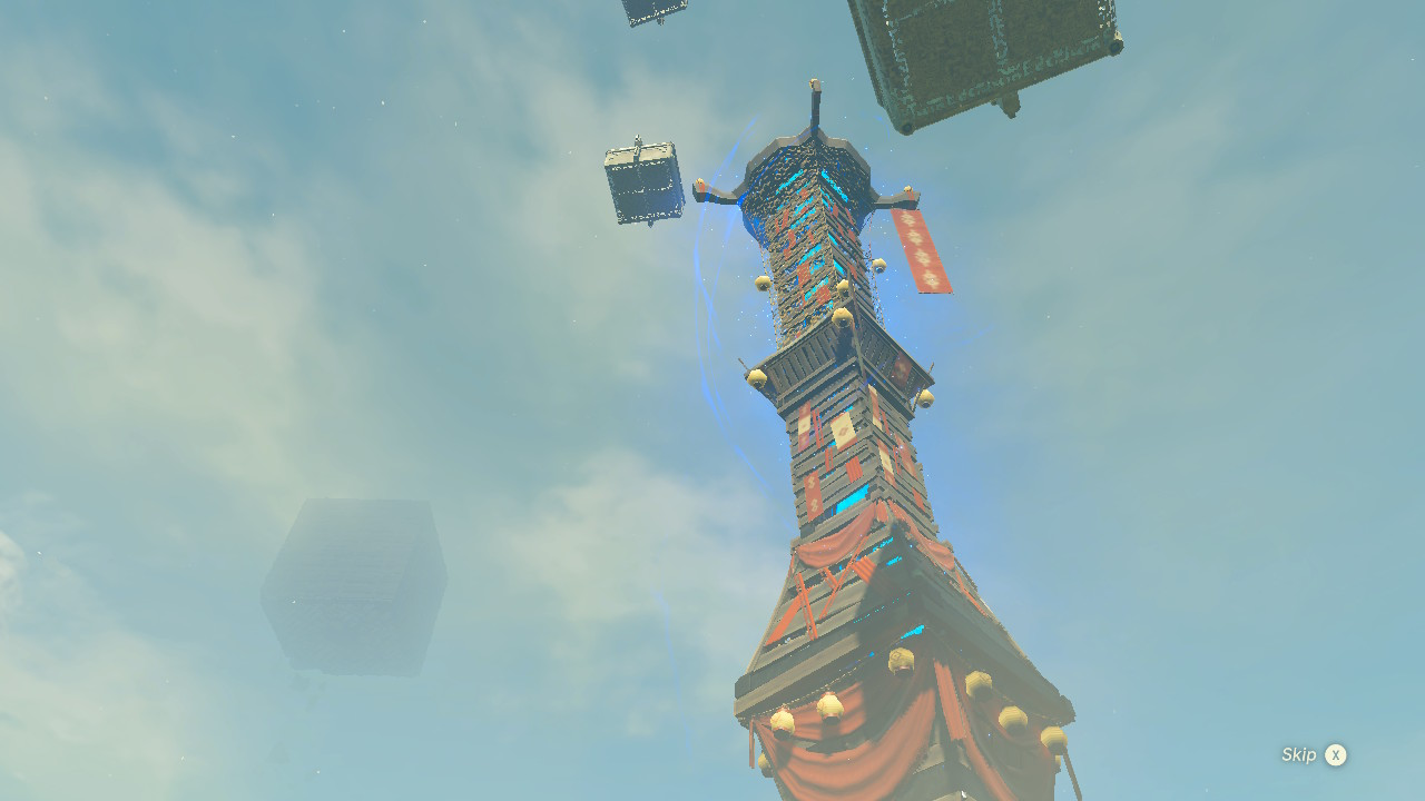 Once you’ve landed on the platform atop the tower, repeat the same process with the rocket, and it will remove the block that’s disabling the tower. You can also carefully jump off the platform and land right under it, on the top of the tower, and use your Ultrahand to move the platform away.