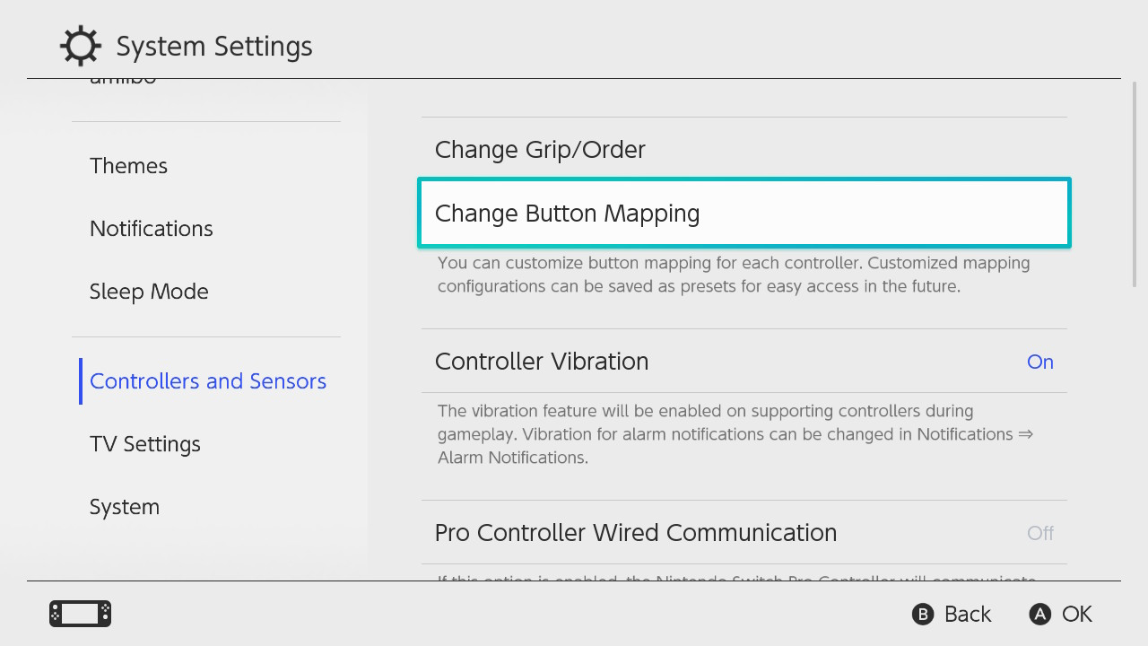 To do this, you’ll have to go to the Nintendo settings menu, head to the settings tab, which is indicated by a gears logo, and then locate “Controller and Sensors” on the list. From there, select the “Change Button Mapping.”