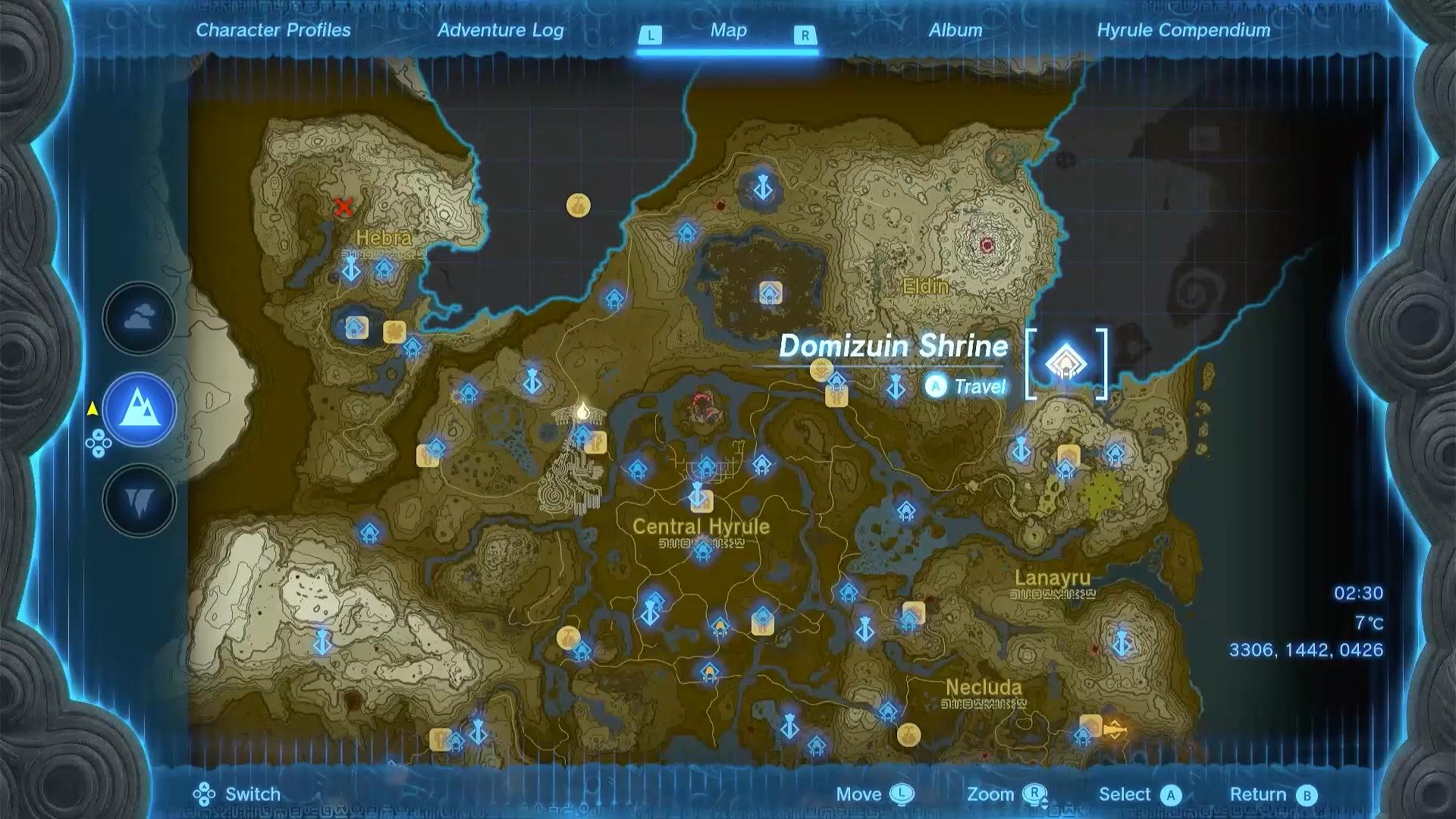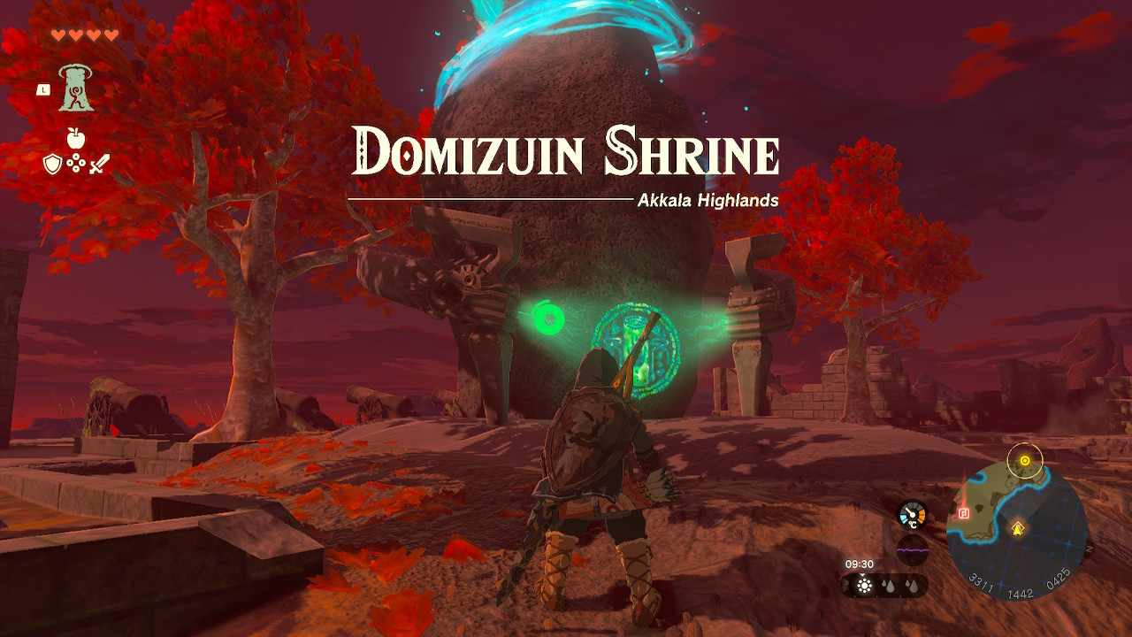 The Domizuin Shrine requires you to just past the border of the Lanayru Great Spring region, but the easiest way to get there is by heading to the Upland Zorana Skyview Tower. This tower will be impenetrable until you shoot a Splash Fruit at the slime blocking its door.