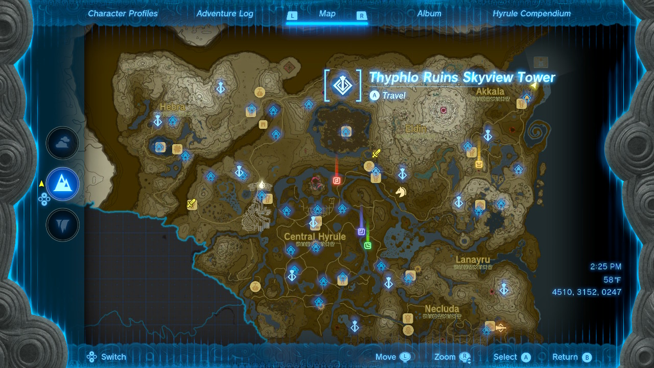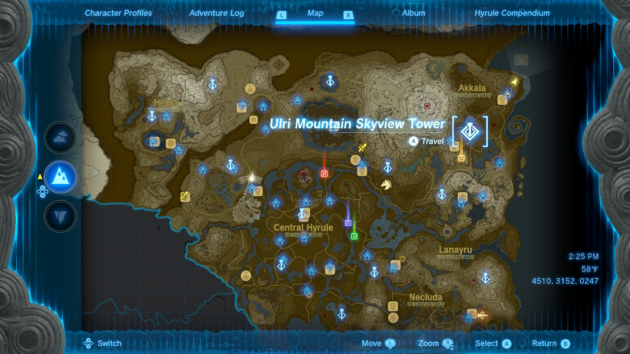 However, these towers are somewhat far from Dinraal most of the time, so you can also jump off sky islands and glide down to try and see the dragon. I used the Akkala Ancient Tech Lab to locate Dinraal one time, which is located to the northeast in Akkala at coordinates 4510, 3152, 0247.