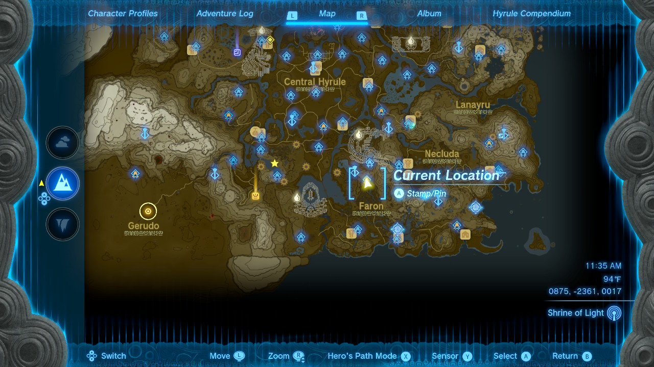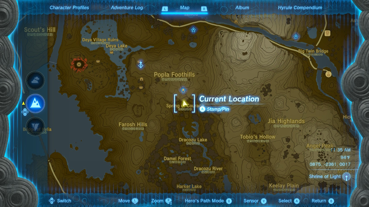 The Spring of Courage can be found at the exact coordinates 0875, -2361, 0017. This location is directly south of the Popla Foothills and west of East Necluda, as shown on the maps above. We recommend using the Popla Foothills Skyview Tower to get there if you’ve unlocked the tower already; the Spring of Courage is only a quick glide from this tower, which will save you time instead of traveling on foot.