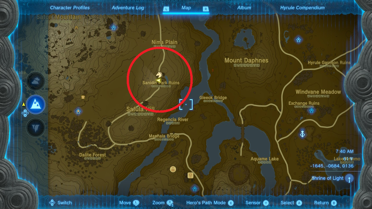 To first find a Stalhorse in TOTK, you’ll need to head to the Sanidin Park Ruins at coordinates -1645, -0684, 0136, marked on the map below.