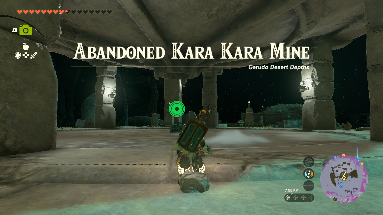 The first piece in the set, the Miner’s Mask, can be found in the western region of the Depths, at the Abandoned Kara Kara Mine. To get to the Abandoned Kara Kara Mine, we jumped into the giant chasm located between the Gerudo Highlands and the Gerudo Desert at coordinates -3620, -1891, 0177, as shown on the map below. Once we landed in the Depths, we headed southeast.