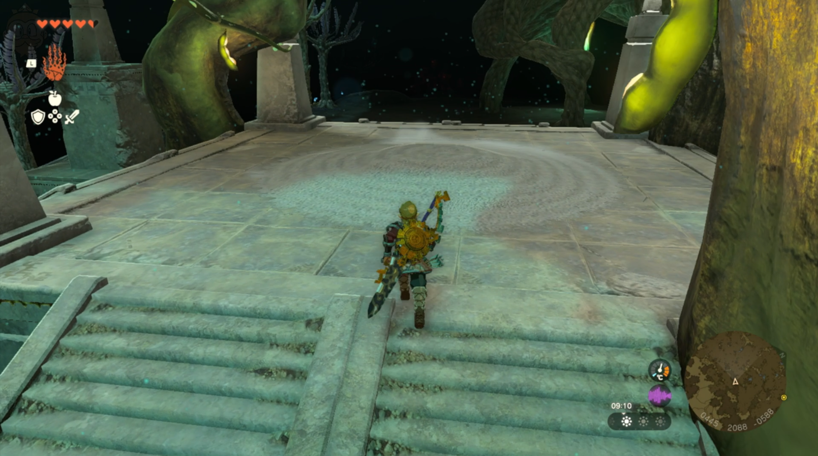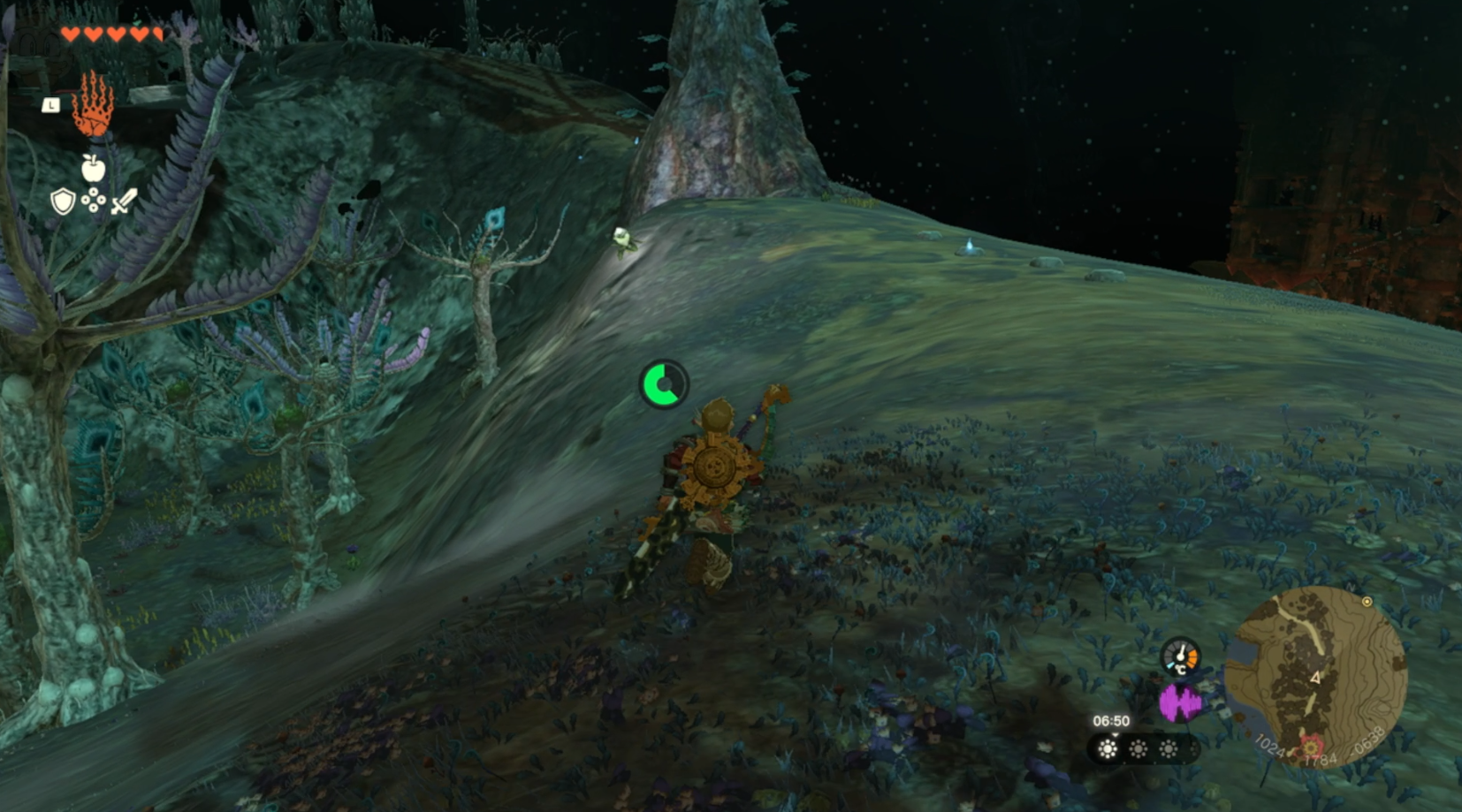 Instead of approaching from the surface like in BotW, you will want to head to the Minshi Woods Chasm to the southwest. Jumping inside will take you into the Depths under the forest and a dark area full of Poes and Gloom.