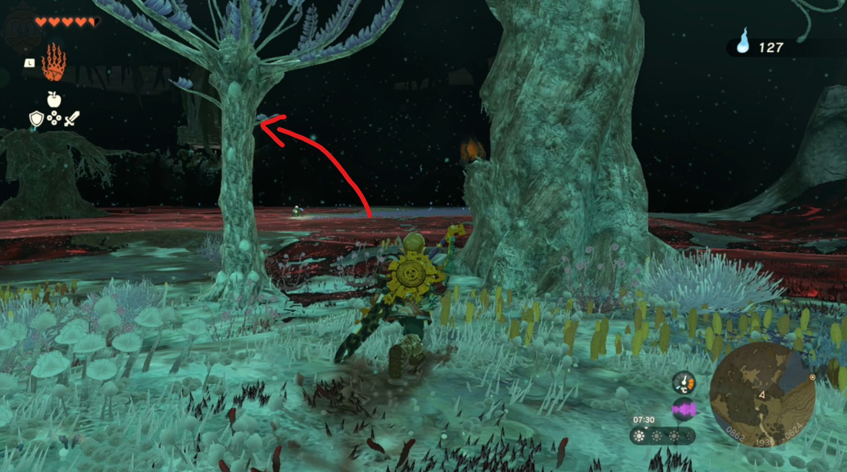 Navigate the area using the trees to avoid the Gloom until you arrive at a large tree with faces on it that you can pass through. From there, find the Rikonasum Lightroot (around 0405, 2134, -0592.) Nearby should be a temple-like structure with a flat ceiling on the inside—use Ascend in this spot to rise into the Korok Forest.