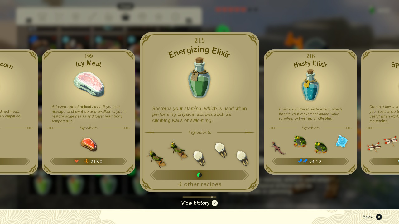 To do so, you’re going to need a different type of critter, Tireless Frogs. Creating Enduring Elixirs follows the same process as above: Open your inventory with the “+” button, select the items you want to hold, and carry them over to a cooking pot. Toss those bad boys in and watch ‘em dance over the open flames. Sorry, Mr. Frog!