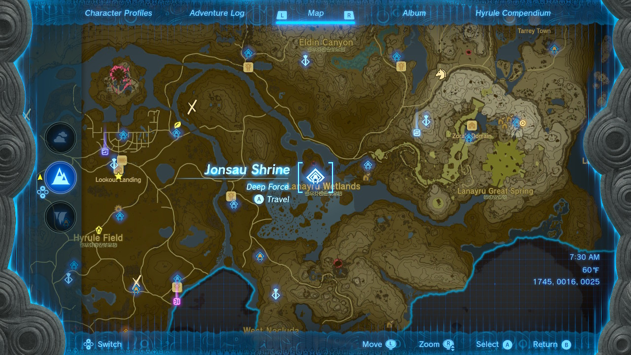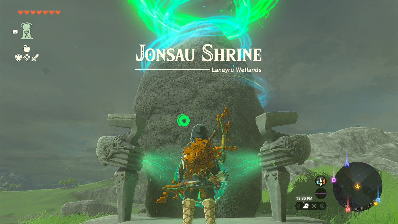 Before you can complete the shrine, you need to first locate it. The Jonsau Shrine can be found in the Lanayru Wetlands at coordinates 1745, 0016, 0025, as shown on the map below. It sits atop a hill in the northern part of the bog, and its neon green and blue aura makes it hard to miss.