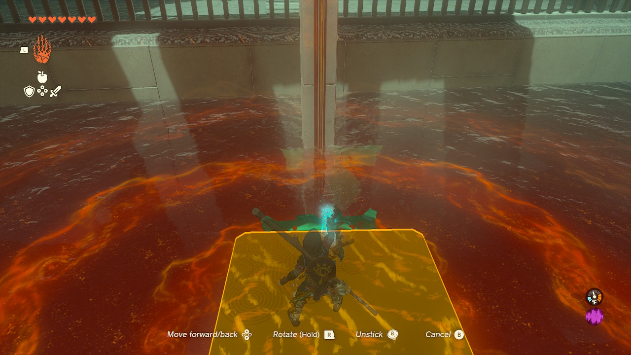From here, you’ll want to attach the float to the bottom of the basket. We ran back into the second chamber to grab the rectangular raft to get a bit closer to the basket for this part. Once you’ve situated your raft on the water, use Ultrahand to lift the basket up, hold it for a few seconds in the air, and then quickly switch to Recall. Select the basket, and it should return to the height you held it at and stay there momentarily. While it’s in the air, switch back to Ultrahand, grab the ball, and attach it under the basket, as shown in our video below.