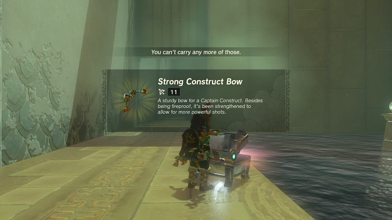 After you head through the chamber’s door, you’ll be greeted by a construct. Once you’ve killed the machine, take a look around using Ultrahand. You’ll notice the shrine’s chest is submerged at the bottom of the water in this chamber. Target the chest using Ultrahand and pull it out of the water. When you open it, you’ll be rewarded with a Strong Construct Bow.